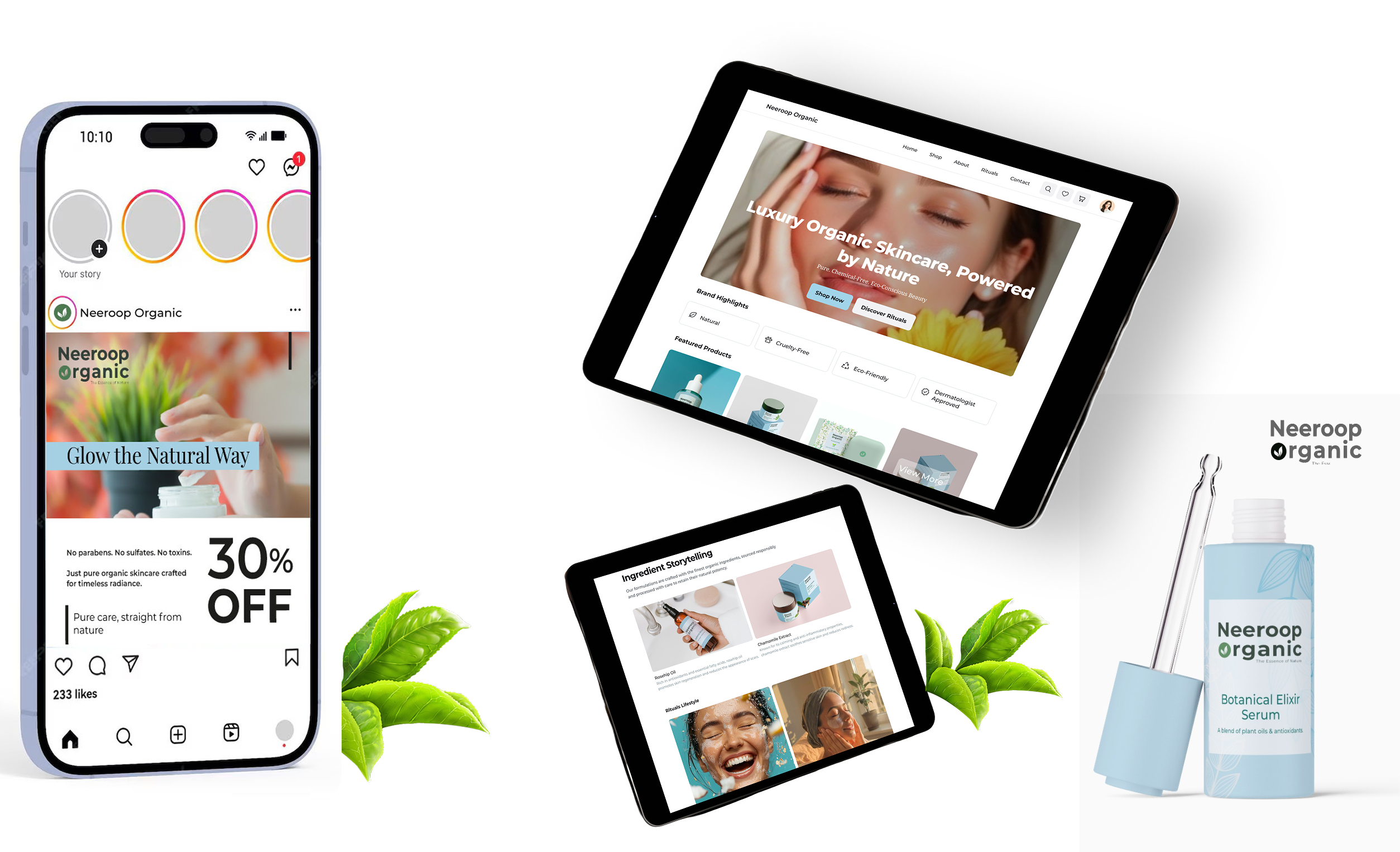 The Neeroop Organic project successfully unified brand identity and digital design into a seamless system that reflects purity, sustainability, and elegance. By combining clean typography, muted organic tones, and storytelling-driven UI, created a premium yet eco-conscious experience that communicates authenticity, builds trust, and positions Neeroop Organic as a modern luxury skincare brand.
